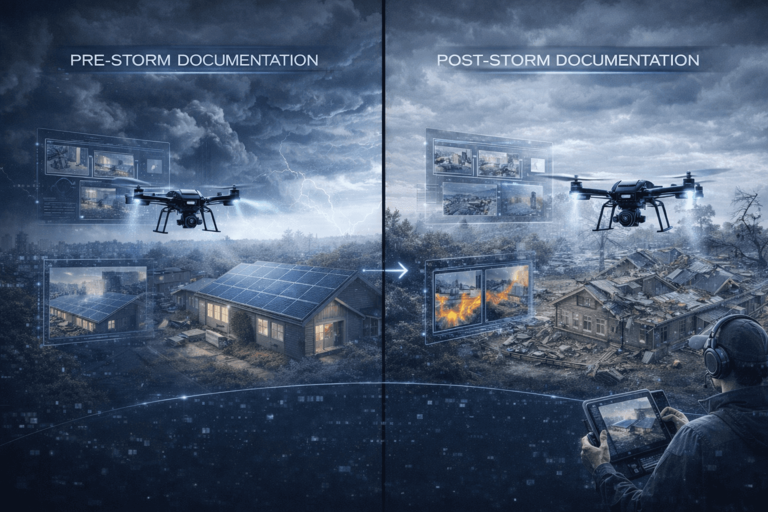 Our storm response services offer comprehensive pre-storm and post-storm documentation for properties and assets. We capture precise aerial and ground imagery before an event, establishing clear baseline records for future comparison.